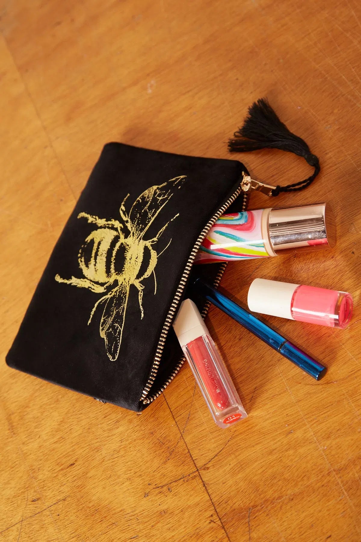 This gold bee velvet make up bag is perfect for busy bees on the go. Crafted in luxurious black velvet, with a waterproof lining and stylish gold bee design, this bag will have you feeling like the queen bee. Plus, the tassel trim adds a touch of sophistication. Bee-utiful!